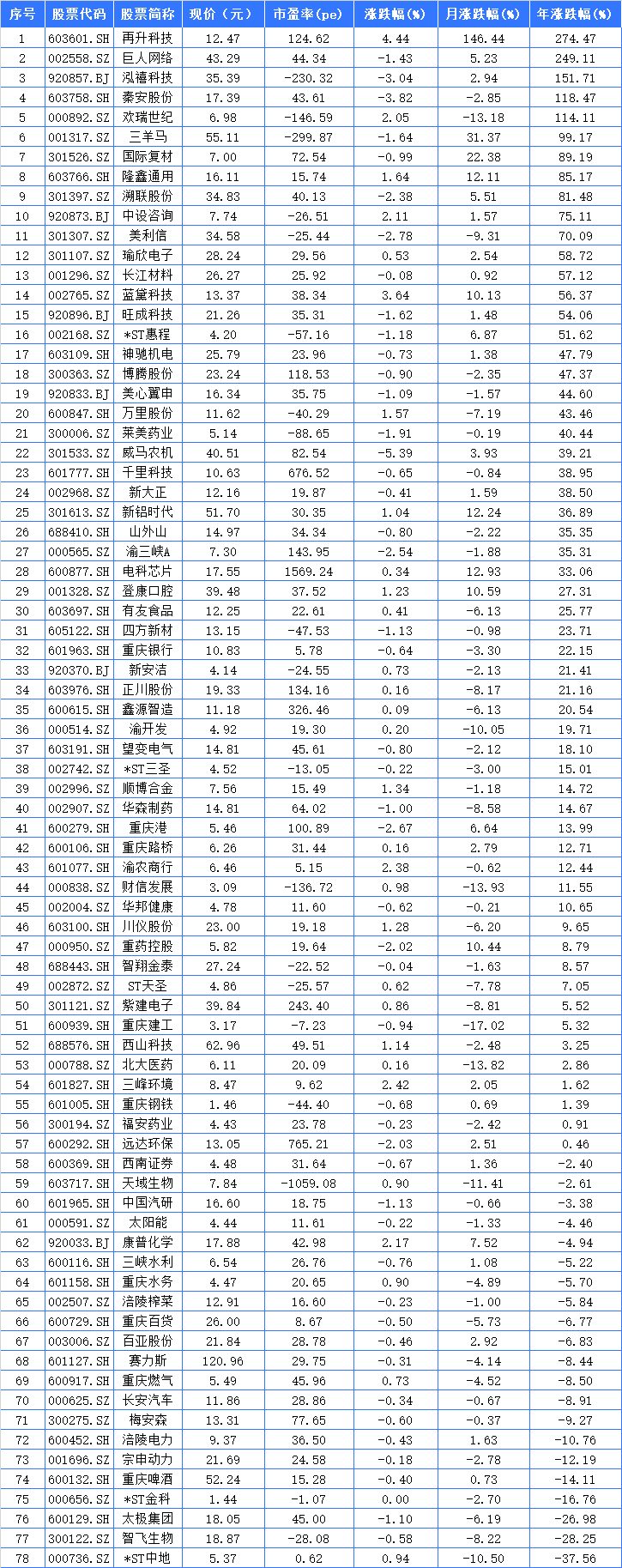 领涨的股票中,再升科技、巨人网络、泓禧科技分别以涨幅274.47%、249.11%和151.71%,位列重庆A股本年涨幅前三强。