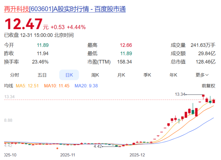 再升科技报收12.47元,日涨幅4.44%,换手率23.46%,月涨幅146.44%,今年以来涨幅274.47%,列第一。