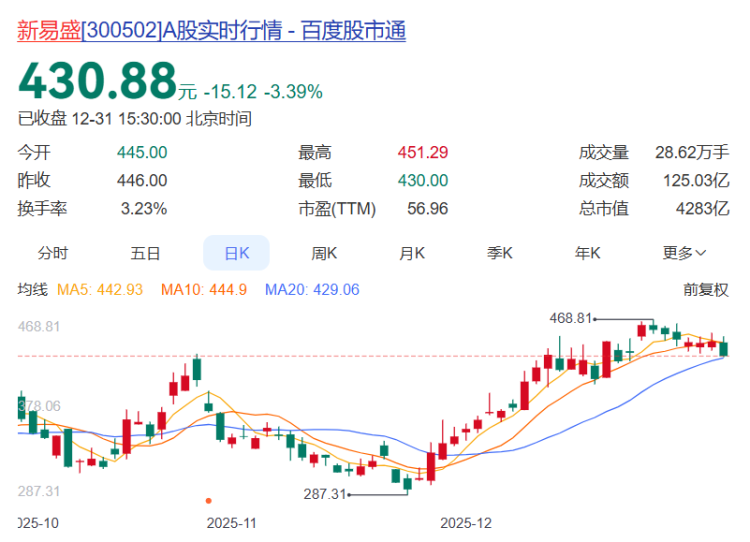 新易盛报收430.88元,日涨幅-3.39%,换手率3.23%,月涨幅23.89%,今年以来涨幅423.96%,列第一。