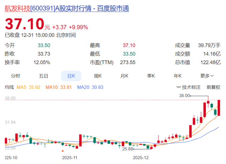 航发科技报收37.10元,日涨幅9.99%(涨停),换手率12.05%,月涨幅38.54%,今年以来涨幅86.90%。