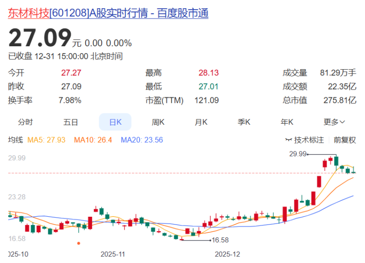 东材科技报收27.09元,日涨幅0.00%,换手率7.98%,月涨幅33.19%,今年以来涨幅264.11%,列第二。