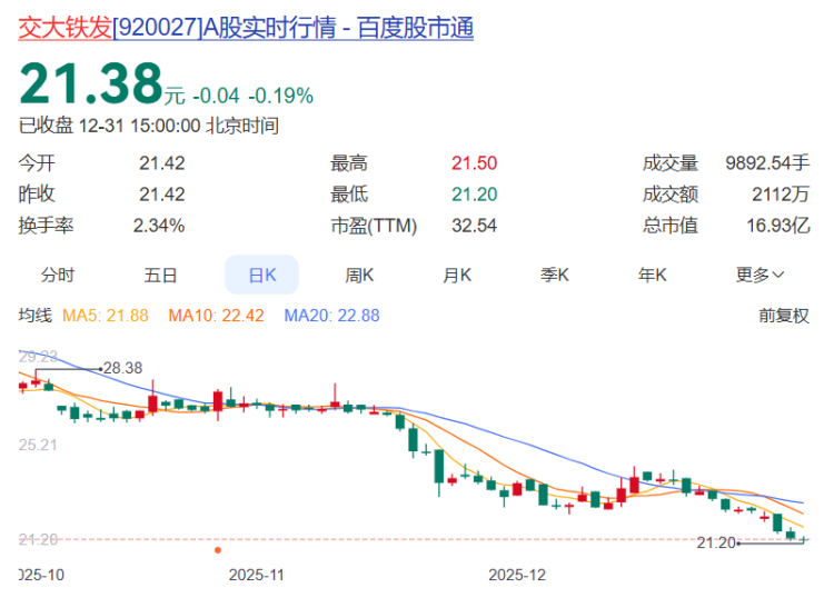 交大铁发报收21.38元,日涨幅-0.19%,换手率2.34%,月涨幅-7.53%,今年以来涨幅-36.71%。